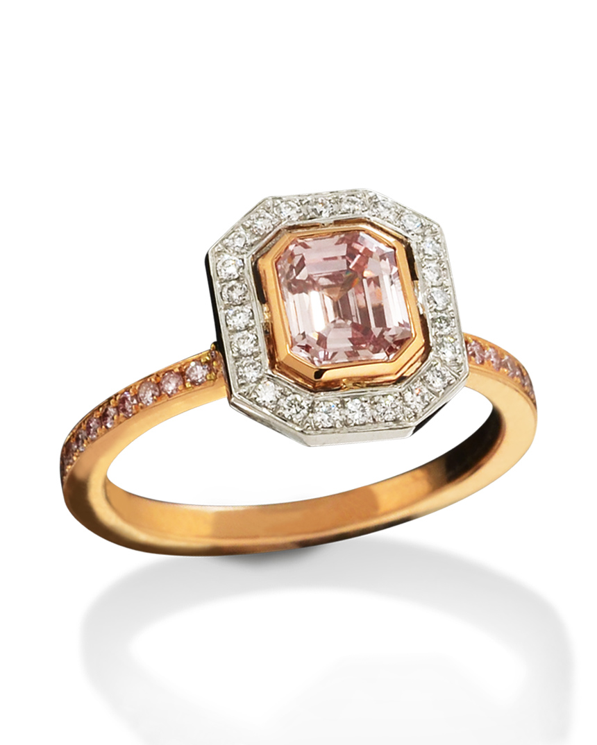 Popular designs for pink diamond engagement rings. If you're looking for something feminine, consider natural pink diamonds in your bridal rings. A symbol of purity and everlasting love, an engagement ring crafted with a rare and natural diamond can easily become an heirloom that delivers joy to generation after generation. No matter the shape of diamond you choose, these are the most classic designs often seen with pink diamond engagement rings. Fancy pink diamond engagement ring: